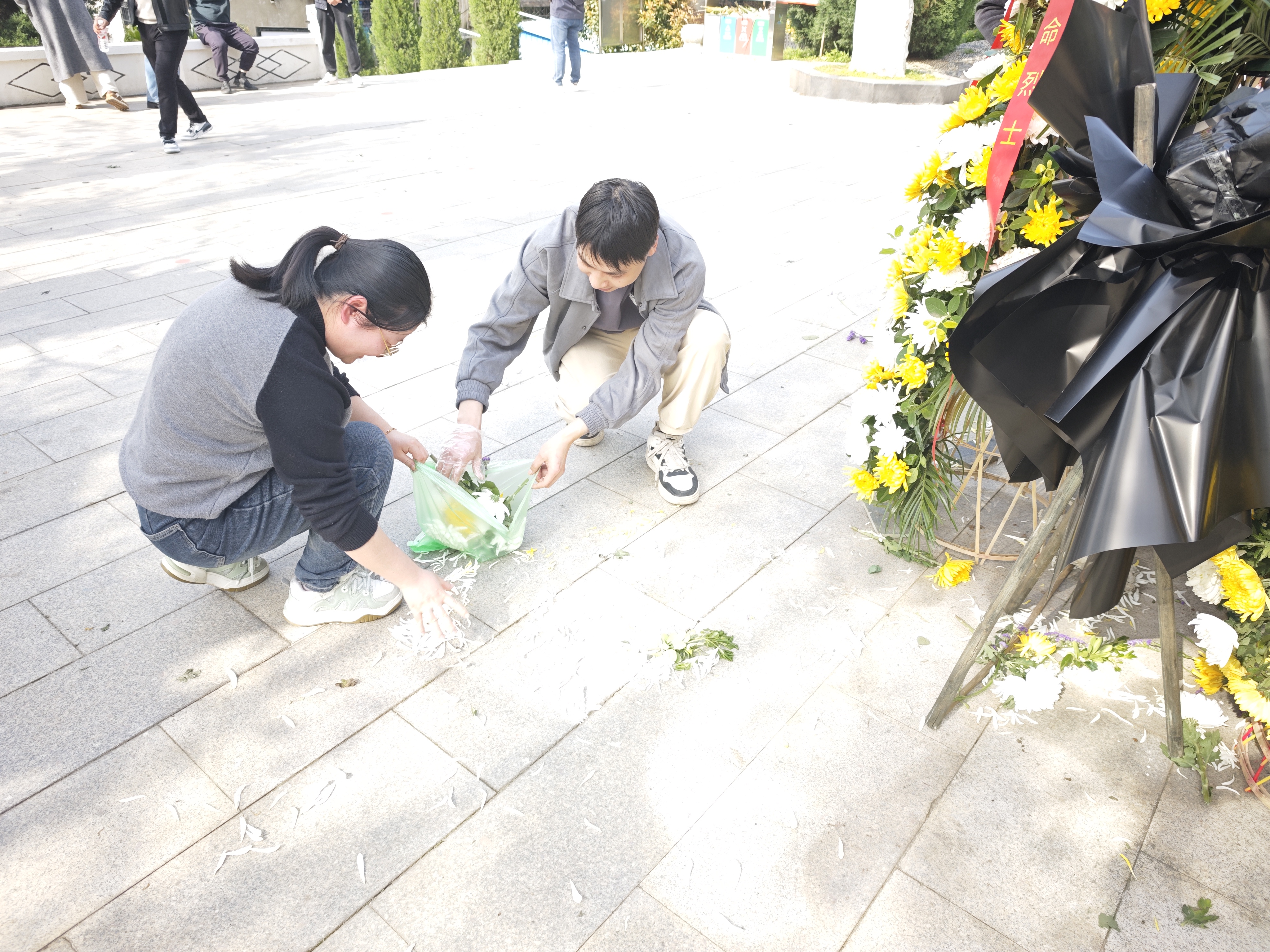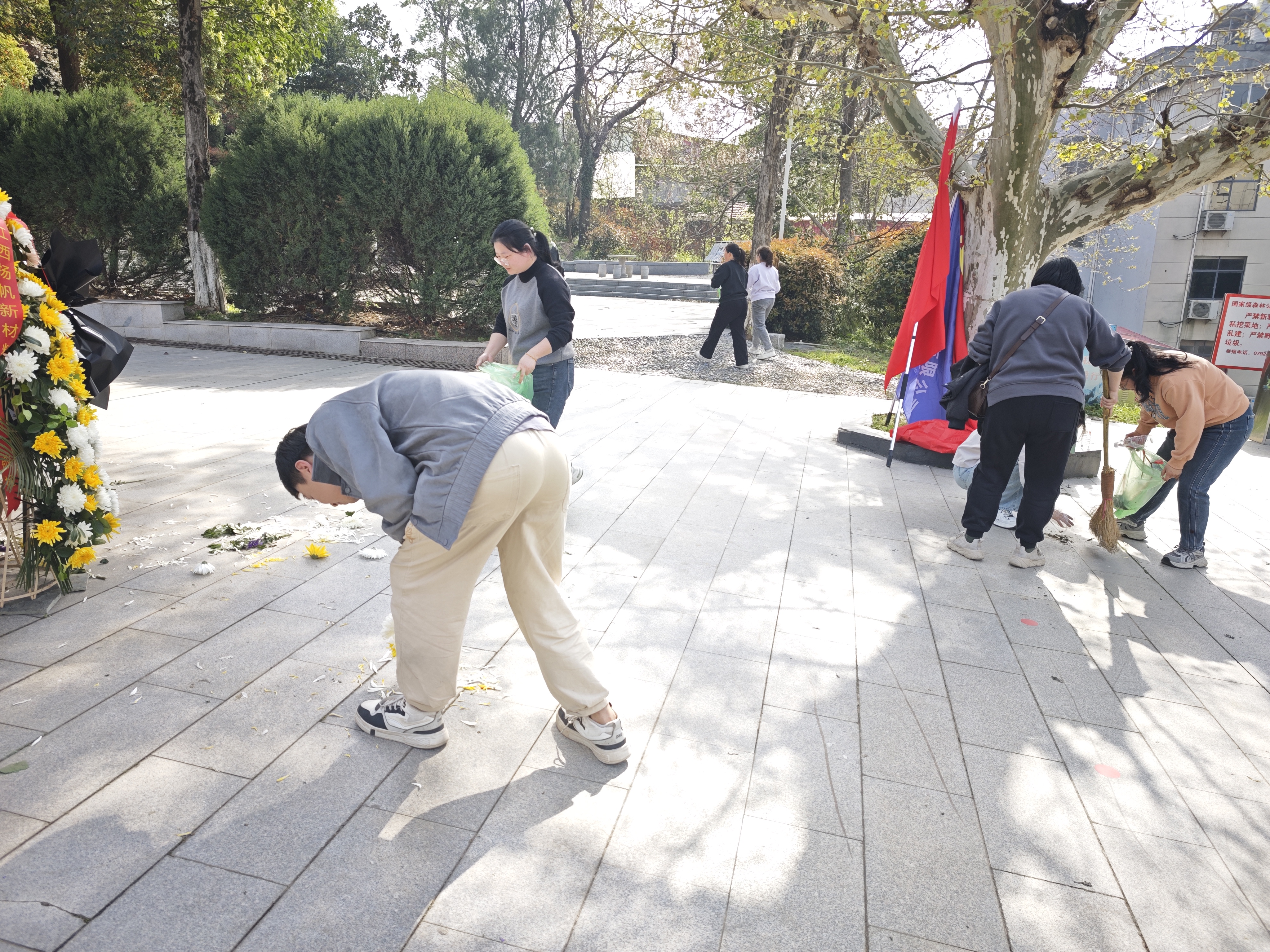 祭掃儀式結(jié)束后,大家化身“志愿守護(hù)者”,在陵園內(nèi)開(kāi)展義務(wù)清掃活動(dòng)。大家手持掃把、垃圾袋,仔細(xì)清理陵園內(nèi)的落花、枯葉、煙頭等雜物,以實(shí)際行動(dòng)維護(hù)烈士陵園的整潔與莊嚴(yán)。經(jīng)過(guò)大家的勞動(dòng),陵園環(huán)境煥然一新,所有人用汗水詮釋了對(duì)革命精神的傳承與踐行。